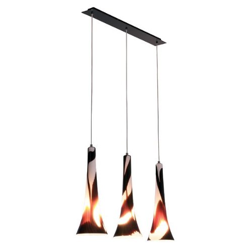 This lively three-light pendant has a long, flat metal base that holds the stems and flared wineglass diffusers in place.
